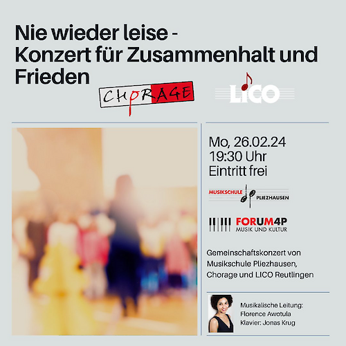 Am 26.02.2024 findet um 19:30 Uhr im Forum4P in Pliezhausen ein Gemeinschaftskonzert mit der Musikschule Pliezhausen und LICO Reutlingen statt.